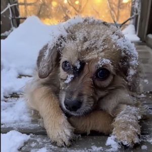 Curled up tight on the frozen porch, this little tan pup was just trying to survive the biting winter wind. His frail body trembled from the cold, and his wide, frightened eyes silently…