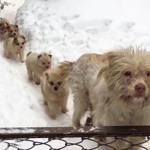 Hungry puppies line up in the snow waiting for their mother to beg for food