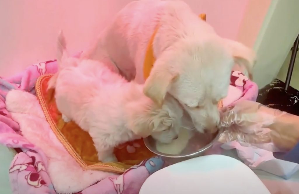 After work, he drove them to a nearby veterinary clinic. The vet gently examined both dogs, running tests to make sure they were healthy. Miraculously, the results came back clear — no signs of distemper, mange, or any other infectious disease. The vet smiled and said, “They’re lucky you found them.” The man sighed in relief. Then came bath time — the water ran brown at first as the dirt washed away, revealing pure white fur underneath. The mother’s expression softened as the warm water soothed her body. The puppy wriggled in delight, his tiny tail wagging for the very first time.