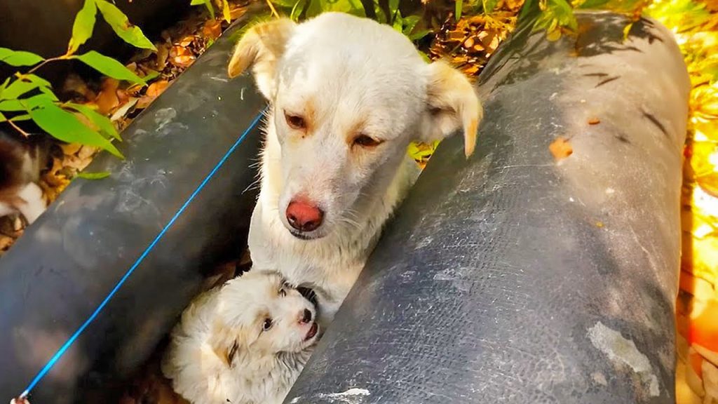 It began on a quiet afternoon when a man was riding home from work and heard faint, desperate cries echoing from the side of the road. At first, he thought it might be a kitten or a bird trapped somewhere, but as he got closer, the sound became clearer — it was the soft, high-pitched whimper of a newborn puppy calling out for help. He stopped his scooter, looked around, and discovered a heartbreaking scene: a mother dog and her tiny puppy huddled between two large metal pipes along the roadside. The spot was dusty, unsafe, and dangerously close to traffic. The mother, thin and trembling, had clearly been living there for days, doing everything she could to protect her only surviving pup.