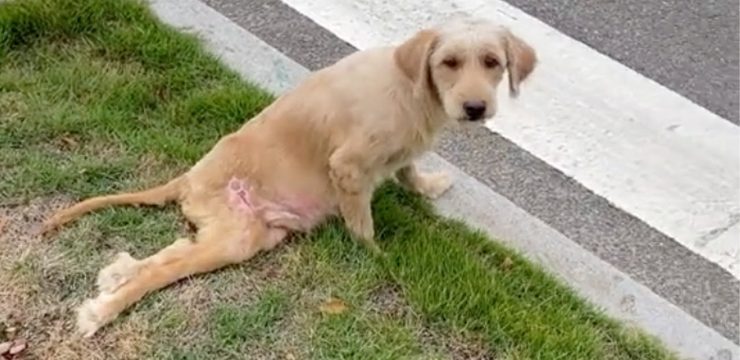 An exhausted stray dog lay curled up on the cold pavement outside a small neighborhood bookstore, her body thin from hunger and her eyes clouded with pain. Customers stepped around her, unsure of what to do, while she barely had the strength to lift her head. One eye was visibly injured, and her abdomen was so swollen that it looked painfully stretched against her fragile frame. She appeared to be carrying far more than her weakened body could bear.