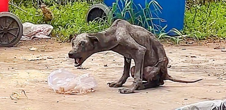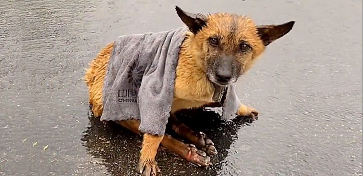 A kind passerby noticed him and stopped. There was something about the contrast that didn’t sit right—the dog’s stomach was distended, yet his legs were thin and fragile, almost skeletal. It was clear this was not a healthy animal. This was a dog in distress. The man approached slowly, expecting fear or resistance, but instead, Shiwu responded with gentle eyes and a faint wag of his tail, as if he still believed in kindness despite everything he had endured.