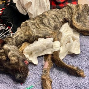 A frail figure lay collapsed along the edge of a bustling roadway, nearly invisible to the world rushing past her. She was a Great Dane, once a majestic and noble breed, now reduced…