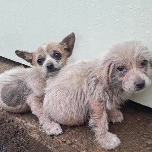 Two tiny puppies curled up tightly together, their frail little bodies shivering in the relentless cold rain. They pressed against each other as if their closeness could provide warmth and protection from the…
