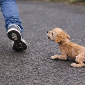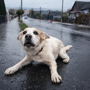She stood frozen at the edge of the street—her thin body trembling, eyes darting back and forth, unsure whether to run or stay. Dust clung to her fur, and the weight of survival…
